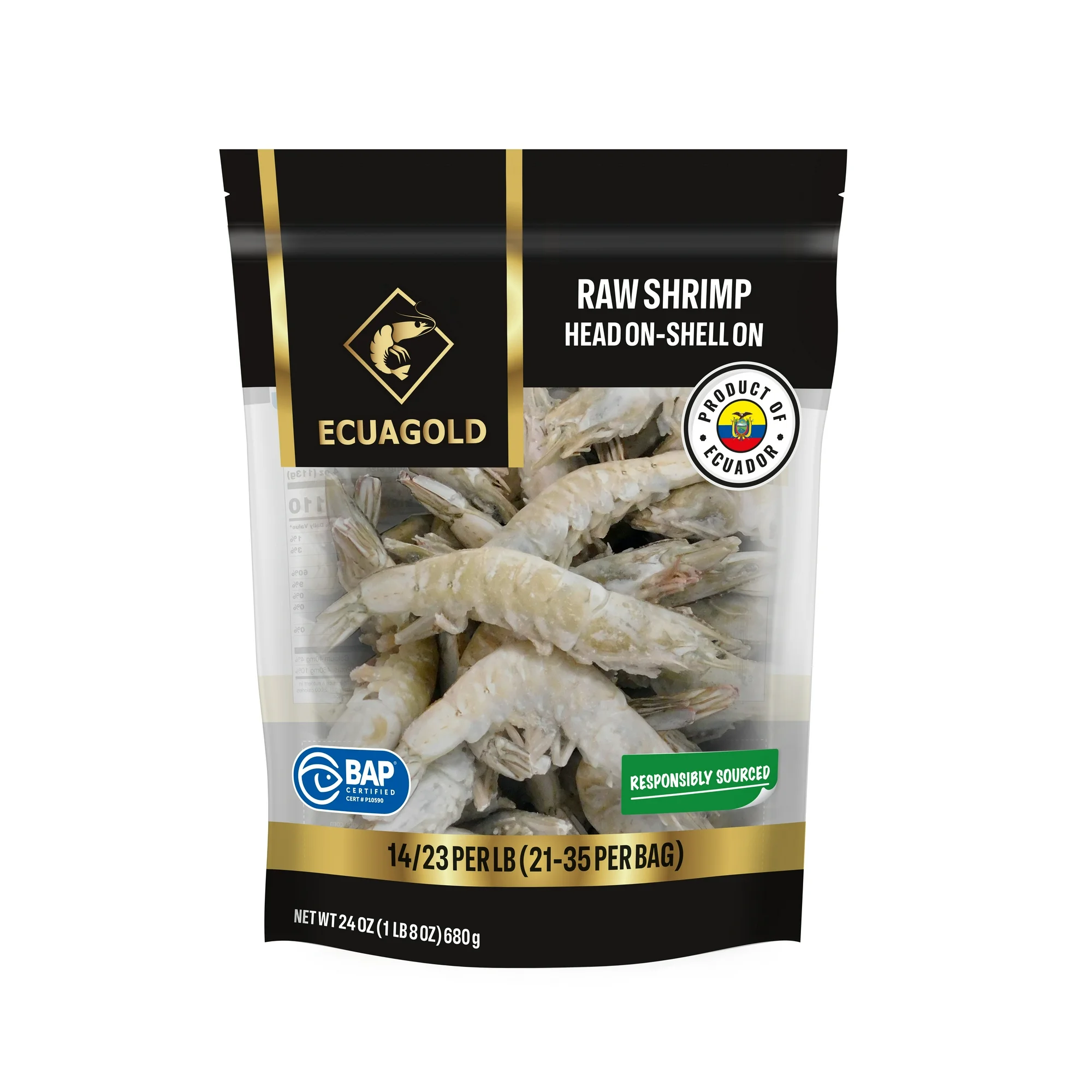 Bring home restaurant-quality seafood with Ecuagold Frozen Raw Head-On Shrimp, harvested from pristine coastal waters and frozen immediately to lock in freshness, flavor, and natural sweetness. These shrimp are large size (14–23 count per lb), making them ideal for grilling, frying, sautéing, steaming, or adding to a classic seafood boil.